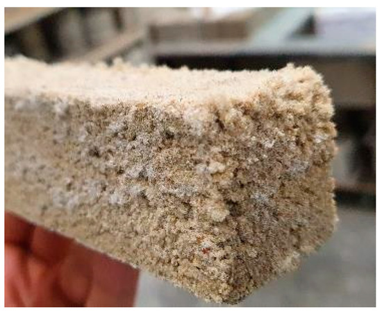 Although the best performance was generally attained by specimens with higher Na2O content, the opposite was seen in WGR-containing mixes; the corresponding N14S0 mix showed a low value of ~9.5 MPa, whereas those with FA, MIBA, and EAFS presented values of ~32 MPa, ~18 MPa and ~37 MPa, respectively. The concentration of Na+ was much higher (both from the activator as well as the precursor itself) than needed for the WGR N14S0 mix, where notable efflorescence was noticed (Figure 8). This phenomenon occurs when the Na+ ions migrate to the surface of the specimens, resulting in the precipitation of sodium carbonates [36]. The high concentrations of sodium hydroxide and sodium silicate are known to affect the development of compressive strength of alkali-activated mixes [36,86]. Vafaei and Allahverdi [87] investigated the tendency of alkali-activated waste glass powder towards efflorescence formation. The study concluded that the tendency is dependent on the concentration of free alkali in the cured alkali-activated concrete specimens. The high free-alkali concentration increases the tendency of alkali to migrate to the surface of the sample, consequently forming efflorescence caused by the weak binding of Na+ ions [88].