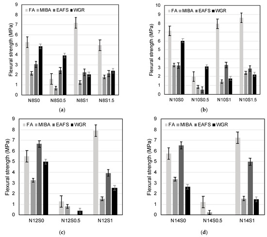 Flexural strength values for mixes with FA, MIBA, EAFS, and WGR with Na2O/binder ratios of (a) 8%, (b) 10%, (c) 12%, and (d) 14%, respectively.