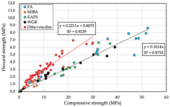 A correlation between the flexural strength results and the compressive strength ones was established (Figure 11). Based on the trendline, the positive correlation coefficient close to 1 (R2 ≈ 0.98) indicated that the two variables (flexural (y-axis) and compressive (x-axis) strengths) are highly correlated, regardless of the variating ingredients’ concentrations of the alkaline activator and the different binders studied. This relationship seemed to be slightly affected by these mentioned varying factors. According to studies from the literature (Figure 11), a slightly lower correlation coefficient (R2 ≈ 0.92) was seen for mortars made with OPC. However, AAMs showed lower flexural strength values for given compressive strengths, compared to mortars with OPC as a binder [92].
