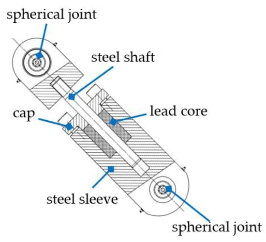 The PS-LED consists of a steel sleeve filled with lead, in which a steel shaft slides due to the effect of an external action, as shown in Figure 1. The linear motion of the shaft is driven by a bushing in the cap, which also prevents the leakage of lead. Spherical joints are provided at either end of the damper to prevent the transmission of bending moments.