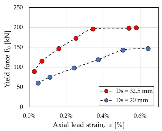 Effect of prestressing on the force of the PS-LED: yield force F0 vs. axial strain ε of the lead core calculated in the numerical analyses considering a shaft diameter (Ds) of either 20 mm or 32.5 mm (adapted from ref. []).