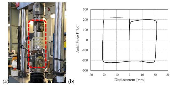 A prototype of the PS-LED, which was rated for a nominal force of 220 kN and a seismic displacement dbd of 20 mm in either direction, was tested at the Materials Testing Laboratory of Politecnico di Milano, using a servohydraulic testing machine (MTS Systems, Eden Prairie, MN, USA) with a load capacity of 500 kN, as shown in Figure 3a.