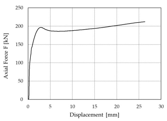 where μk is the coefficient of friction at the interface between the shaft and the lead core; p is the contact stress at the interface; and A is the area of the lateral surface of the shaft sliding within the lead core. Prestressing the lead core increases the contact stress p, and hence the force of the damper, permitting the achievement of high strength combined with small dimensions of the device. Previous numerical simulations have demonstrated [] that the force F0 of the PS-LED increases almost proportionally with the axial strain of the lead core ε until a certain strain level is reached, corresponding to the yielding of the lead core, and beyond which no further increase occurs, as shown in Figure 2.
