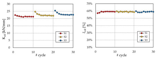 Figure 5 illustrates the variation in the effective stiffness Keff and the equivalent damping ratio ξeff at each cycle of the tests S1, S2, and S3. Disregarding the first cycle of each sequence as recommended in the standard [], the mechanical properties remained practically unchanged during the tests, with a maximum variation in Keff and ξeff, with respect to the values assessed at the third cycle of S1, of +7.3% and −2.6%, respectively. Eventually, it must be reported that, by adding up all the cycles performed in the experimental program (Table 1), the PS-LED prototype sustained a total of 55 cycles at the design seismic displacement without a deterioration of its properties, demonstrating the absence of low-cycle fatigue effects.