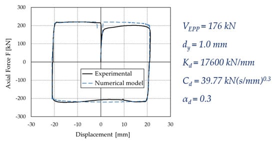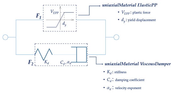 The EPPV model was coded in OpenSees [,] by using a zeroLength element [] associated with a Parallel material, which includes two material objects, the uniaxialMaterial ElasticPP [] and the uniaxialMaterial ViscousDamper [,]. This model is defined by 5 parameters: the yield displacement the plastic force of the uniaxialMaterial ElasticPP material object; the stiffness ; the damping coefficient and the velocity exponent of the uniaxialMaterial ViscousDamper material object.