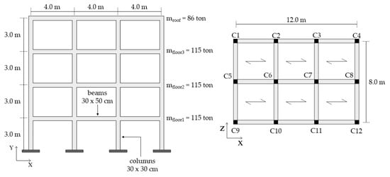 Elevation view and plan with the main dimensions of the RC case-study structure [].