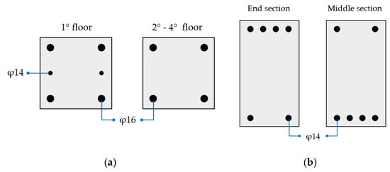 The RC building is a 4-story structure located in the municipality of Potenza (Italy), which corresponds to a medium/high seismic area according to the classification of NTC-18 []. The elevation and plan view of the building, with the relevant main dimensions, are illustrated in Figure 8. The column and beam longitudinal reinforcements are shown in Figure 9; concerning the transversal reinforcement, the columns have φ6 stirrups spaced at 15 cm, whereas the beams have φ6 stirrups spaced at 15 cm at the end sections and at 20 cm elsewhere. The compressive strength of concrete is 20 MPa, and the yield strength of steel is 375 MPa; additional information can be found in reference []. The building was designed in the 1980s by considering vertical loads only and disregarding the effect of earthquake. Only the collapse of the case-study structure in bending is considered, while other possible failure mechanisms, e.g., shear failure of beams, columns or beam–column joints, bond slip, and low-cycle fatigue, which are rather common for old-code buildings [], are not considered in the present work.