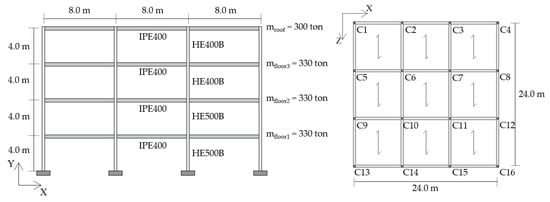The steel MRF building [,,] is shown in Figure 10, where the section and the length of the structural elements are reported. The peculiarity of this building consists of presenting different stiffnesses and strength capacities in the two main horizontal directions, due to the preferred orientation of the column sections, with their strong direction aligned to the Z-axis. The beams and columns are made of S355 steel.