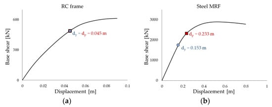 Different performance requirements were assumed for the two buildings. For the RC structure, the retrofit target was to avoid inelastic deformation of the structure under the effect of the basic design earthquake. In particular, the target displacement was defined, in agreement with reference [], as the ending point of the elastic part of the capacity curve, as shown in Figure 11a. This performance level corresponds to the Immediate Occupancy performance level, which guarantees that the structure is immediately accessible after a main earthquake, since the strength and the stiffness of the structural elements are not compromised. On the contrary, in the case of the steel MRF, a controlled inelastic deformation of the main frame was permitted, with activation of plastic hinges and limited reparable damage, corresponding to a ductility factor of µF = 1.5 in accordance with the figure assumed in previous studies [], as shown in Figure 11b.