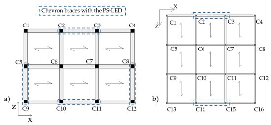 Plan layout of the Chevron braces equipped with the PS-LED: (a) RC structure, and (b) steel MRF.