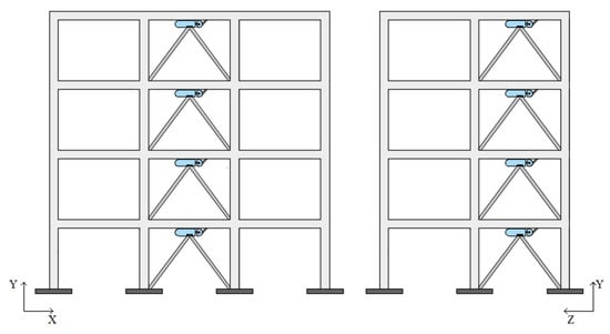 The implementation of energy dissipation devices inside structural frames has proven to be an effective technique for improving the seismic behavior of existing constructions [,,,,,,,,,]. Generally speaking, energy dissipation devices can be categorized into two families, namely fluid viscous dampers, which response depends on the rate of deformation, and hysteretic dampers, which response mainly depends on the magnitude of deformation []. While fluid viscous dampers are more popular for strategic structures (such as hospitals, police stations, and fire stations) and high-rise buildings [,,,,,,,,,], hysteretic dampers are generally used for the retrofit of ordinary buildings, as demonstrated in numerous studies [,,,,]. In framed structures, energy dissipation devices are usually incorporated within steel braces installed between consecutive floors [], which permits the activation of the dampers by exploiting the relative displacement between the stories. The combination of steel braces and energy dissipation devices is beneficial since the braces provide an increase in structural stiffness that reduces structural displacement, while the dampers, through the dissipation of seismic energy, dampen vibrations and reduce structural acceleration [,,,]. However, the installation of damped braces in existing structures requires an important amount of construction work, resulting in significant disturbances for occupants and critical alterations to the building layout because of their excessive dimensions, which ruin the esthetic and architecture of buildings [].