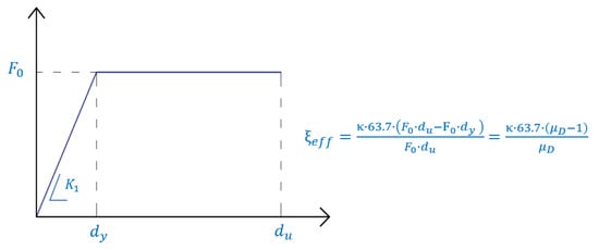 The properties of the dissipative braces are distributed at each story according to a proportionality criterion [], which ensures that the first modal shape of the bare frame remains unvaried after the upgrade. This choice, which is justified by the vertical regularity of the buildings, avoids drastic changes to the internal action distribution in the frame, at least in the range of the elastic behavior. Moreover, the chosen distribution of strength of the dissipative braces aims at achieving simultaneous yielding of the devices at all the stories and, thus, a global ductility of the bracing system coinciding with the ductility of the single brace []. Table 4 and Table 5 report the values of F0 and K1 of the dampers at each floor of the RC structure and of the steel MRF, respectively, as evaluated from the design procedure assuming μD = 20, which corresponds to an equivalent viscous damping ratio ξeff = 55% (Figure 14).