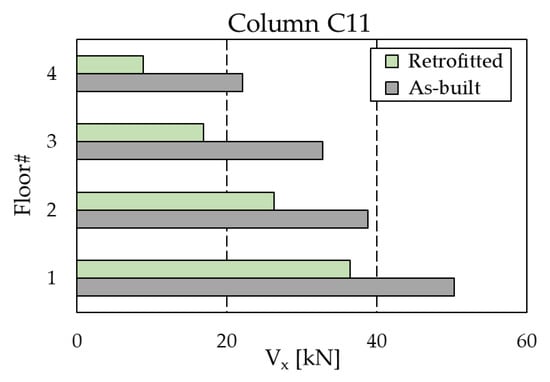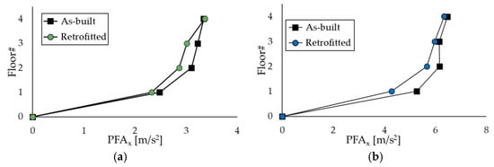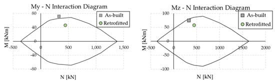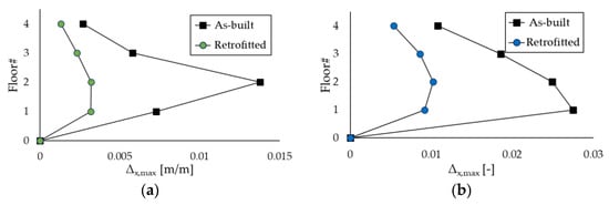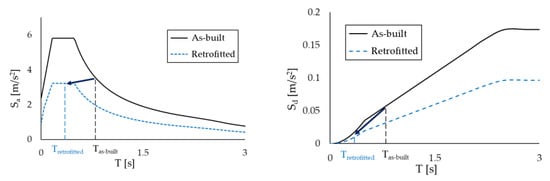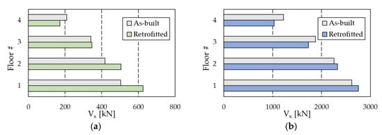 Figure 11 shows the capacity curves of the two case-study structures in the X-direction; the blue dots on the curves identify the ending point of the elastic part, while the red dots highlight the assumed performance point. For the sake of conciseness, the results in the Z-direction are not reported, but the target displacement is 0.045 m for the RC structure and 0.265 m for the steel MRF, respectively. The seismic analyses of the bare frames (not reported in this paper for brevity) highlighted that, due to the preferred orientation of the column sections with their strong axis aligned in the Z-direction, the steel MRF needed to be upgraded in the X-direction only; interested readers can refer to [] for more details. On the other hand, the RC frame needed to be strengthened in both directions.