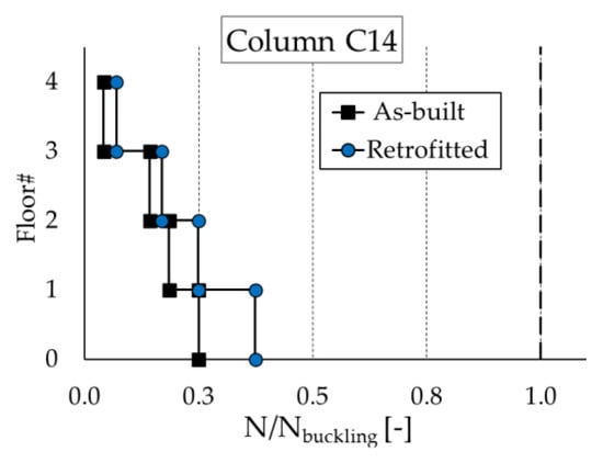 Finally, an “axial buffer”, modeled as a zeroLength element object [] with zero stiffness in the axial direction and high stiffnesses in shear and bending, was introduced in the RC frame model between one end of each beam and the adjacent node, in order to eliminate the axial force fictitiously generated by the interaction between the fiber sections of the beam elements and the rigid diaphragm [].