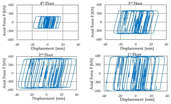 The steel braces were assigned to have a stiffness twice the PS-LED stiffness, as suggested, e.g., in [], in order to guarantee that the largest part of the deformation of the story is concentrated in the damper, which enhances the amount of energy dissipation [,].