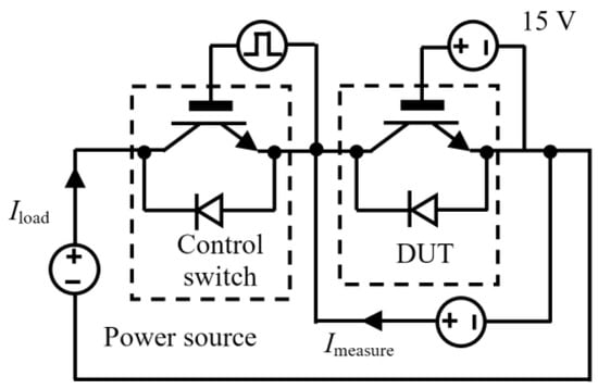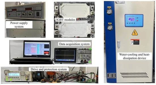 Figure 2 shows the power cycling test platform, which consists of a main power source, test power source, signal generator, drive protection circuit, data acquisition system, and water cooling system. Figure 3 shows the circuit diagram for direct current (DC) power cycling. Two IGBT modules are applied here; one is the device under test (DUT), and the other one is the control switch. After the test begins, a constant driving voltage of 15 V is applied to the gate of the DUT to ensure the device remains conductive. The control switch is turned on to connect the main circuit and supply a constant load current (Iload) of 400 A to the DUT. The power loss causes the DUT junction temperature to rise rapidly. Then, the control switch is turned off to cut off the main circuit, and the cooling system is turned on to ensure that the DUT cools down rapidly. A control strategy of a fixed turn-on and turn-off time (ton = 2 s and toff = 2 s) is employed during the test. A 4 s cycle is used, and the temperature of the water cooling system is set to 45 °C. Additionally, to estimate the junction temperature of the DUT, a constant measurement current (Imeasure) of 100 mA was applied. The on-state collector–emitter voltage Vce-on at 100 mA was measured when the load current was disconnected.