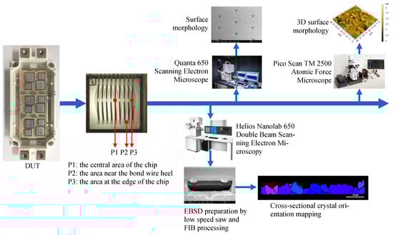 After the power cycling test is completed, the evolution of the microstructure of the Al metallization layer on the surfaces of the chips of the four IGBT modules is observed. Figure 4 shows the steps used to characterize the Al metallization layer. First, the IGBT modules are processed by removing the housings, lead terminals, and silica gel [17]. Second, the surface morphology of the Al metallization layer is observed using scanning electron microscopy (SEM). The surface roughness is measured before and after the power cycling test using atomic force microscopy (AFM). Third, the Al metallization layer is ion-thinned using a focused ion beam (FIB) for observation of the layer cross-section with FIB-SEM. Fourth, electron backscatter diffraction (EBSD) is employed to analyze the texture of the FIB-etched region.