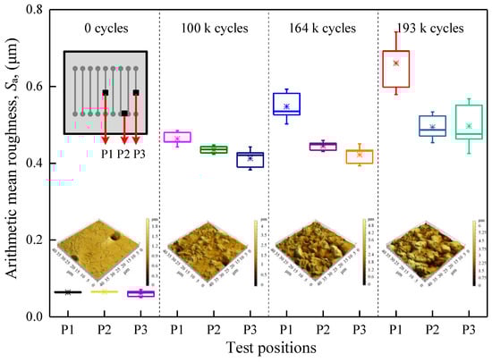 This behavior indicates that the temperature has a significant influence on Sa during power cycling. The higher the temperature, the more severely the surface morphology is degraded by power cycling. Sa is largest at P1, followed by P2 and P3; that is, the smallest change in the surface morphology and the lowest Sa occur at P3. In addition, the temperature exhibits cyclical fluctuations during power cycling. The deformation of the Al metallization layer also varies with the temperature during a cycle. As the number of power cycles increases, both the extent of plastic deformation and the rate of change in Sa increase.