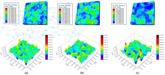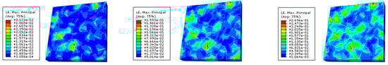 To study the effect of the grain size on the evolution of the surface roughness, the same first- and second-level submodels at the chip center are used to establish three third-level submodels with grain sizes of 4 μm, 5 μm, and 6 μm, as is shown in Figure 16. The corresponding numbers of grains are 107, 55, and 32, respectively. The grain orientations in all the models are randomly distributed.