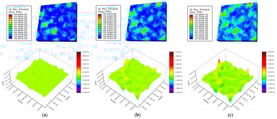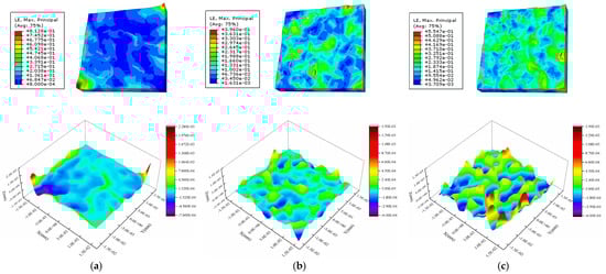 Figure 13 shows the strain and surface morphology of the Al metallization layer calculated using the three models after 2000 s of power cycling. Figure 14 shows how Sa obtained using the three models with mean grain orientation differences of 15°, 45°, and 90° changes with the cycling time. Figure 13a shows that for a mean orientation difference between neighboring grains of 15°, two very large peaks in the height appear, which affects the overall average Sa. A small grain orientation difference results in interconnections between some grains, such that grains with the same orientation evolve into a larger grain and slip between grains decreases considerably to reduce Sa. However, the formation of abnormally large grains results in the transfer of the stress and strain to the boundary of the whole grain model along with the grain boundaries, and the strain in other regions decreases accordingly. The abnormally large grains undergo further deformation, resulting in severe strain localization and an extremely large peak in the surface roughness. This phenomenon is quite rare in the model with a large grain orientation difference.