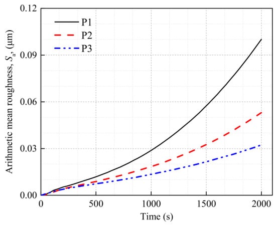 Figure 8, Figure 9 and Figure 10 show the calculated strain and surface morphology fields of the Al metallization layer at three positions on the IGBT chip surface after 200 s, 1200 s, and 2000 s of power cycling. Figure 11 shows the variation in Sa with the number of power cycles determined by a statistical calculation of the normal plastic deformation of the surface. As the number of power cycles increases, the surface of the Al metallization layer at the three positions gradually changes from flat to uneven, and Sa clearly increases. For example, Sa at P1 is 5.29 × 10−3 μm after 200 s of power cycling. Increasing the cycling time to 2000 s causes Sa to increase nearly 19-fold to 0.100 μm.
