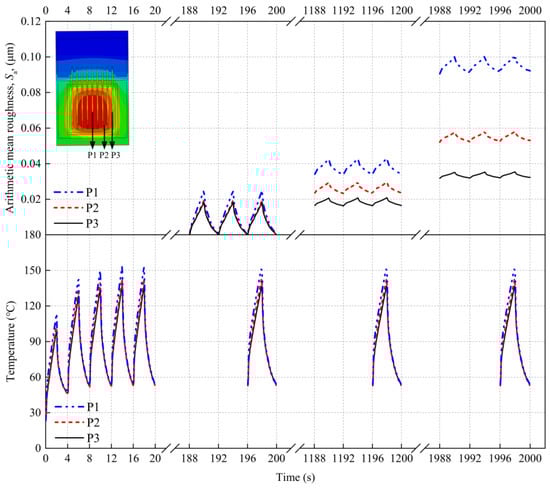 The variation in Sa with position mainly results from the uneven surface temperature of the IGBT chip during power cycling. Figure 12 shows the calculated temperatures at the three test positions during power cycling. During the turn-on stage of a cycle, the temperatures at the three positions continuously increase and peak at the moment the current is cut off. The maximum temperatures at P1, P2, and P3 are 157.87 °C, 153.77 °C, and 142.40 °C, respectively, where the maximum temperature at P1 is significantly higher than that at the edge. The nonuniform temperature distribution over the chip surface causes the thermal stress of the Al metallization layer to vary with position. The change in the surface morphology of the layer is mainly caused by plastic deformation resulting from thermal stress. Thus, an uneven distribution of Sa can be observed on the surface of the IGBT chip. In particular, Sa is largest at P1, where the temperature is highest, followed by P2 and P3.