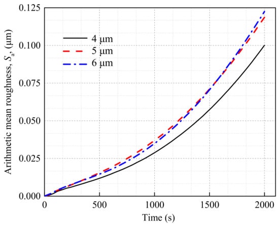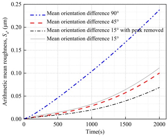 Removing the peak in the surface roughness for the three models with mean grain orientation differences of 15°, 45°, and 90° results in a Sa of 0.068 μm, 0.100 μm, and 0.238 μm, respectively, after 2000 s of power cycling. That is, the Sa increases with the grain orientation difference. The reason for this result is that as the orientation difference between adjacent grains increases, the deviation in the deformation between grains increases, resulting in a rougher deformed surface. The Sa of the model with a grain orientation difference of 90° is 137% higher than that of the model with a grain orientation difference of 45°. This result indicates that the grain orientation has a considerable influence on the surface roughness of the Al metallization layer.
