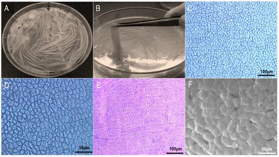 Fresh amniotic membrane macroscopic and microscopic observation. (A) Horizontal spread; (B) Clamp with tweezers; (C) Fresh AM under microscope (×100); (D) Fresh AM under microscope (×200); (E) HE staining of AM (×100); (F) SEM of fresh AM (×2000).