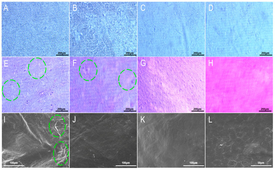 Bright field, HE staining and SEM images of HAAM by different methods. (A) Low concentration method after 12 h (×200); (B) High concentration method after 12 h (×200); (C) Low concentration method complete after 36 h (×200); (D) High concentration method complete after 24 h (×200); (E) Low concentration TritonX-100 method (×200); (F) High concentration TritonX-100 method (×200); (G) Hypertonic saline method (×200); (H) NaOH scrape method (×200); (I) Low concentration TritonX-100 method (×800); (J) High concentration TritonX-100 method (×800); (K) Hypertonic saline method (×2000); (L) NaOH scrape method (×800). The circles represented broken peeling of the amniotic surface.