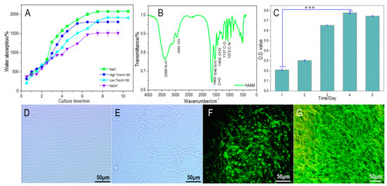 Physicochemical properties and biocompatibility of HAAM. (A) Water absorption curve of HAAM by different methods; (B) Infrared spectroscopy of HAAM; (C) Proliferation activity of PC12 on HAAM, ***: p < 0.001; (D,E) Microscopic observation of PC12 cells cultured 2 and 4 days; (F,G) The fluorescence staining of PC12 cells cultivated on freezing dried HAAM cultured 2 and 4 days.