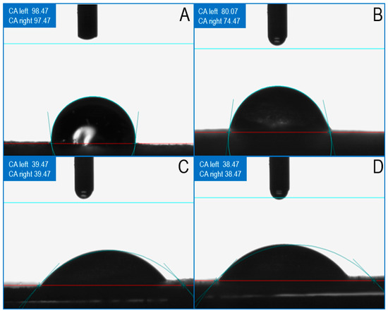 Contact angle with water of different scaffolds. (A) 6% PLA film; (B) 6% PLA +3% nHAp film; (C) 6% PLA +3% nHAp +2% HAAM film; (D) 6% PLA +3% nHAp +6% HAAM film.