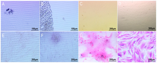 Staining observation and microscope photographs of osteoblasts’ primary culture and continuous culture. (A,B) Primary osteoblasts on the 2nd and 5th day, respectively; (C,D) P4 osteoblasts on the 2nd and 4th day, respectively; (E,F) ALP staining; (G) Alizarin red staining; (H) H&E staining.