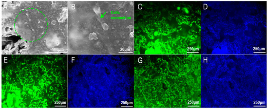 Viability and distribution of osteoblasts on the scaffold. (A,B) SEM of cell–scaffold compound (A: ×1000; B: ×3000, The circles represented the zoom position); Hochest and Calcein-AM stainings of (C,D) 6% PLA +3% nHAp +2% HAAM; (E,F): 6% PLA +3% nHAp; (G,H) 6% PLA.