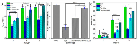 Figure 8B shows that osteoblasts have the highest 4 h adhesion rate on HAAM, up to 92.33%, which again indicates that HAAM has superior cell adhesion ability. Among the three groups of scaffolds, pure PLA scaffolds had the lowest adhesion rate, only 30.34%. After the addition of nHAp, the cell adhesion rate of scaffolds increased to 56.34%, indicating that the addition of nHAp provided more abundant adhesion sites for osteoblasts. In the composite scaffolds with both HAAM and nHAp, the adhesion rate reached 83.67%. It was significantly higher than pure PLA scaffolds and PLA+nHAp scaffolds, and achieved a large number of osteoblast adhesion in a short time.