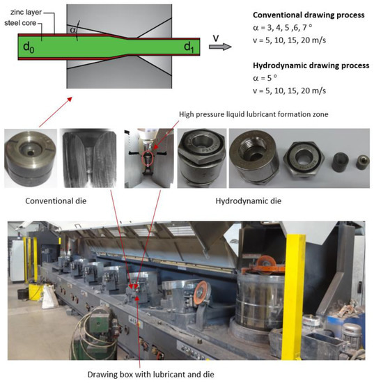 - Suliga, M.; Wartacz, R.; Hawryluk, M. The Multi-Stage Drawing Process of Zinc-Coated Medium-Carbon Steel Wires in Conventional and Hydrodynamic Dies. Materials 2020, 13, 4871. [Google Scholar] [CrossRef]