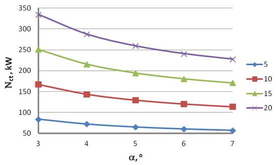 Influence of the drawing angle α on the theoretical wire drawing power in respective drafts; v = 10 m/s.