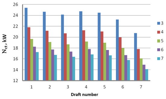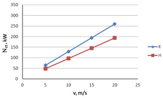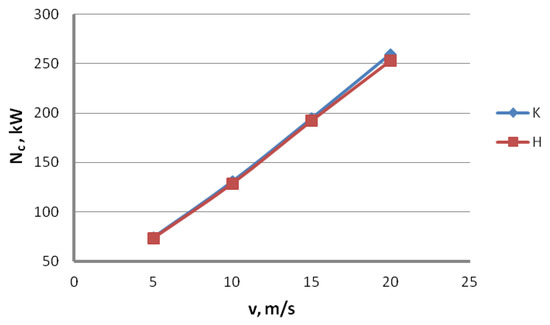 Total drawing power Nc in the process of drawing wires with an initial diameter of 5.5 mm and end diameter of 2.2 mm, for wires drawn in conventional dies with a drawing angle α = 3, 4, 5, 6, 7°, and in hydrodynamic dies with a drawing angle α = 5° (5H), v—drawing speed.