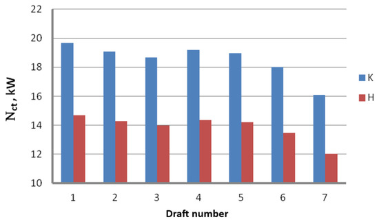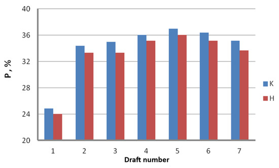 Percentage engine load P in respective drafts for the wires manufactured using conventional K and hydrodynamic H methods.