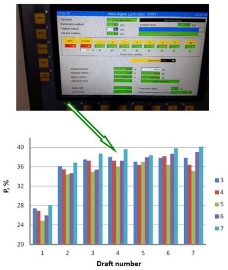 Control panel of the Mario Frigerio machine and percentage load of the engines P in respective drafts for the wires drawn with the angle α = 3, 4, 5, 6 and 7° and drawing speed of 20 m/s.
