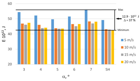 The total amount of electric energy E required to manufacture 100,000 tons of 2.2 mm wire, depending on the drawing technology used, where α—drawing angle, H—hydrodynamic dies, v—drawing speed.