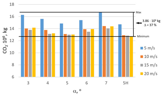 CO2 emissions related to the consumption of electric energy E required to manufacture 100,000 tons of 2.2 mm wire, depending on the drawing technology used, where α—drawing angle, H—hydrodynamic dies, v—drawing speed.