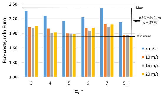 Eco-costs related to the consumption of electric energy E required to manufacture 100,000 tons of 2.2 mm wire, depending on the drawing technology used, where α—drawing angle, H—hydrodynamic dies, v—drawing speed.