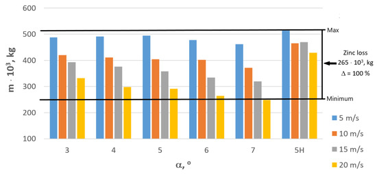 Total mass of zinc per 100,000 tons of 2.2 mm wire, depending on the drawing technology used, where α—drawing angle, H—hydrodynamic dies, v—drawing speed.