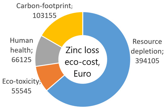 Subsequently, using the weighing method, the amount of zinc coating in the drawing process has been calculated, allowing the determination of losses of zinc depending on the drawing technology (relative to 100,000 tons of wire per year). Zinc production and hot-dip zinc-coating process affect the natural environment more severely than steel production. This is why it was essential to determine the influence of zinc losses on the increase in the environmental pollution level. Then, knowing the total amount of zinc coating the wires and the total annual factory output (100,000 of coated wire), an analysis of the zinc losses, CO2 emissions, and eco-costs was conducted. Much like in the case of energy consumption calculation, Idemat software has been used (app version 2.9.0.).