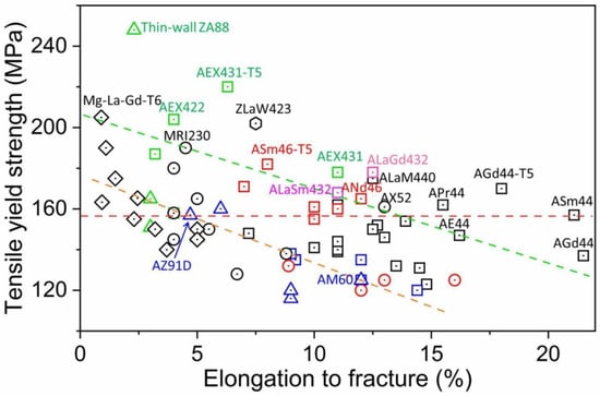 In engineering applications, the strength–ductility synergy of the structural materials plays an important role in their safe use [,,]. However, the low strength and poor ductility of Mg alloys seriously limits their wide application, particularly in power train components []. Generally, excellent strength–ductility synergy has frequently been observed in wrought Mg alloys, particularly in Mg-RE [,,], Mg-Al [,], Mg-Li [,], and Mg-Zn [,,] systems. Nonetheless, progress in their preparation is not expected in many cases. Thus, developing HPDC Mg alloys with high strength and high ductility could dramatically promote the application of Mg alloys, especially in the automobile, electronic, and aerospace industries [,]. As is well known, HPDC technology generally results fine grains of 5–16 μm, and the mechanical properties of HPDC Mg alloys highly rely on their intermetallic characteristics, such as the crystal structures of the intermetallic phases [], the intermetallic skeleton morphologies [,], and in some cases the solid solutes or precipitates []. This paper reviews the strength and ductility of various HPDC Mg alloys at room temperature and states the corresponding microstructural characteristics, aimed at serving as a guide for the future development of HPDC Mg alloys with high strength and high ductility.