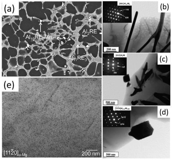 (a) Representative SEM image of traditional AE44 alloy, BF-TEM images, and/or SAED patterns of (b–d) intermetallic phases and (e) fine precipitates in the Mg matrix [,].