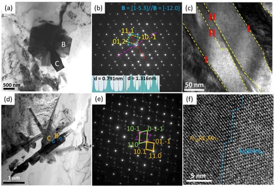 (a,c,d) BF-TEM images; (b,e) SAED patterns; (f) high-resolution TEM (HRTEM) images of Al-Mn-RE phases in AE44 alloys [,].