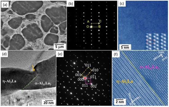(a) SEM image; (b) SAED pattern; (c) atomic resolution HAADF-STEM image of the new phase in ALaM440 alloy; (d) TEM image; (e) SAED pattern; (f) atomic resolution HAADF-STEM image of the coexistence of η-Al3La and Al11La3 [,].