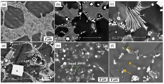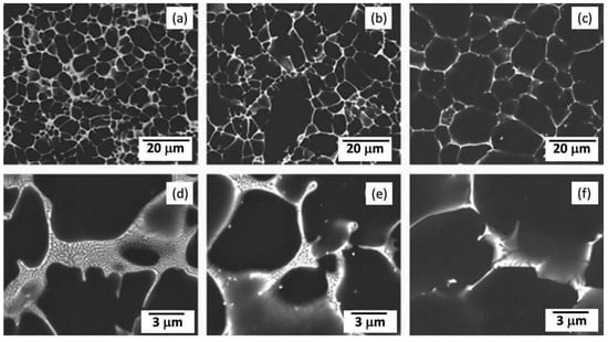 SEM images showing microstructures in the HPDC (a,d) Mg-3.44La; (b,e) Mg-2.87Ce; (c,f) Mg-2.60Nd alloys [].