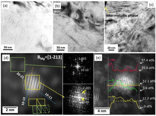 (a–c) TEM and (d,e) atomic-resolution STEM images showing precipitates in ASm46 alloy [].